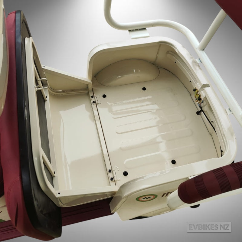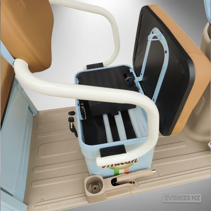 - Front Storage: 2 front baskets and a large utility area under back seat or can be lifted up and becomes twice the size storage area.